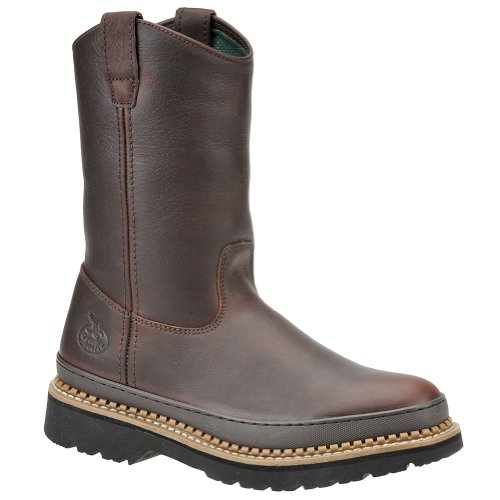 These pull on work boots feature Soggy brown full-grain leather uppers. Georgia utilizes Goodyear Welt construction to attach the polyurethane outsole making these guys fully repairable should you wear them out. The sole is oil- and slip-resistant for solid footing on a variety of surfaces. They have a stitched, oil-resistant rubber bumper to guard against abrasion.