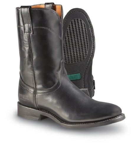 BARGAIN OUTFITTER'S 'GUIDE GEAR' ROPER BOOTS - For a very long time I have been a 'slip-on' kind of guy, wearing loafers or Crocs due to my physical disabilities. However, for about 2/3 of my life I wore BOOTS. We were raised wearing those square-toed clod-hopping boots and I rapidly developed a taste for the "roper" style with its elegant simplicity and beauty. It's basically like a high-topped loafer and is good for the feet.This roper-style boot is a fantastic fit and as far as I can tell at this early stage, quite well made. I do not generally support things made in China, or the companies that outsource like that. In this case, however, I can see some benefit. I badly needed a pair of ropers and was not willing to pay the minimum $135 they would have cost in my size had I got them from Justin, for example.This pair as far as I'm concerned is about as good and will serve me quite well. Though I need some assistance getting them on/off, as most do with boots, a finely made pair of ropers will essentially slide on/off easily - as these do. Struggling with a boot that does not want to let go, or won't let in your foot in the first place, is indicative of a problem. These boots don't have that problem.There is also the question of new boots hurting and requiring breaking-in ... and that is just ignorance on the part of the customer. Know your shoe/boot size! My size is 11EE, and I ordered these in 11EEE. A fine fit. With lots of shoes on Amazon, I read reviews by people who don't know their proper size or how to determine their proper size.Better get that straight before you buy ANY shoe. Especially boots. Boots ought not to hurt, need no breaking-in period, and should fit like carpet slippers on the first day. THAT is a good boot, but more importantly, that is the RIGHT SIZE for you.Finally, I am attracted to the fine leather and I know I'll have to polish/buff the heck out of these to get the proper deep shine. It's the soles I really like. They look like vulcanized rubber but I'm certain they are not. Whatever they are, they look like they can defeat an oil slick or a frozen river. That is the type of sole a boot must have, and that's the type I really need.Even for a picky boot connoisseur, I recommend these boots as a nice old back-up pair for work, wintry days and to wear to funerals. You may be going up Mud Hill, Ice Hill or Boot Hill, and this pair of boots will be a fine companion for any trip.