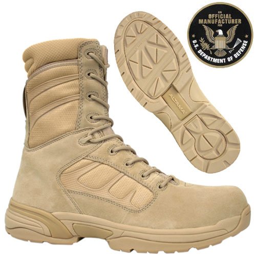 Altama EXO-Speed: Full athletic performance and duty-boot protection in one... desert ready! Fast, light and tough! Altama's revolutionary EXO-Speed Boot Series combines the latest advancements in running shoe technology with the durable construction and safety features duty boots require. From the bottom up these Boots are loaded with features to maximize your performance as you chase down bad guys, batter in doors, rappel out of helicopters, whatever you do to earn your hazardous-duty pay. These are the Boots that get that kick butt, take names and get the job done. Period. Hardcore features: No-polish suede-leather leather construction combined with highly breathable, abrasion-resistant "air mesh" nylon; Molded EXO-skeletal support structure provides structural integrity to the boot without increasing weight; Molded ankle overlay for lateral stability as you run or maneuver; Complete non-metallic construction for security check points; Oil and acid-resistant outsole features multi-directional lugs for grip in any direction plus two flex channels in the forefoot to reduce fatigue and molded nylon ladder shank for support; Triple-density midsole uses a shock-absorbing "donut" in the heel, energy-return pod in to forefoot for maximum toe-off and feather-light material in the arch to minimize weight Ortho-lite footbed transfers shock directly to the cushioning midsole donut; Aero-spacer dual-zone lining provides superior wicking and moisture management for all-day comfort... anti-microbial treatment for stink-resistance 9 eyelet lacing system; Each approx. 8" tall, 25 ozs. Get the Boots that get the job done. State Size and Width. Please Note: This item is shipped directly from the factory. Please allow an extra 2-4 weeks for delivery... sorry no express shipping available. We are unable to ship factory direct items to Canada, Puerto Rico or APO or FPO addresses. Men's Altama 8" EXO-Speed Desert Tactical Boot, Tan