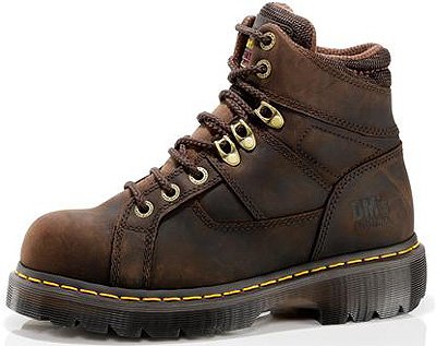 It's true. These Dr. Martens Industrial Steel Toe Oxfords weigh a feathery 29 ozs. apiece. Now, PRICED LESS! A fussy inspector labeled these as "factory seconds" due to a slight blemish. No way does it effect wear. Only the discounted price off the usual store tag. Made to last: Full-grain leather uppers. Dr. Martens oil and chemical resistant air-cushioned outsole absorbs shock and adds bounce to your step. Removable Cambrelle lining and padded footbed for comfort. Cambrelle lining offers moisture wicking. Repairable Yellow stitch. Goodyear welt. Industrial ANSI 75 rated steel toe. 3/4-gussetted tongue locks out debris. Each is 4 1/2" tall. State Size. Medium width. Half sizes order the next larger full size. Order ONLINE Now! !!! Limited Quantities !!! Men's Dr. Martens Steel Toe Oxfords, Brown (factory seconds).