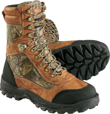 Lightweight and comfortable, these tough, full-grain leather boots with 900-denier nylon panels are a great choice for hunting and scouting excursions. 800-gram Thinsulate Ultra Insulation adds warmth for cold-weather hunts. A waterproof Aqua-Shield barrier wards off moisture. Removable, polyurethane insoles ensure that you can cover the miles you need to without exhausting your feet. Padded collars and tongues with moisture-wicking linings for dry comfort. Steel shanks provide lasting support. High-traction bob outsoles grip tough terrain without picking up debris. Abrasion-resistant rubber heel and toe guards. Imported. Height: 10".Average Weight: 3.7 lbs./pair.Men's sizes: 7-13 medium width; 9-13 wide width.Camo pattern: Realtree AP .