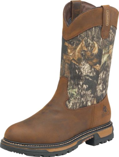 Dark brown leather and Mossy Oak Break-Up nylon, Guaranteed Rocky(r) waterproof, Removable cushion footbed, Kid's Ride outsole is rugged and durable,